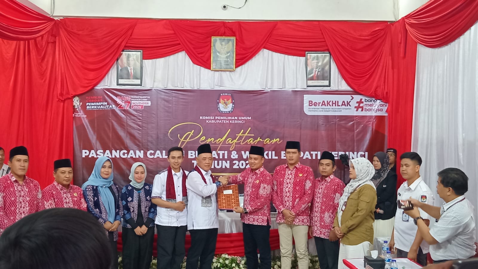 Dengan mengusung tagline “HTK Juara”, pasangan tersebut tiba di KPU Kabupaten Kerinci tepat pada pukul 14.35 WITA. Kedatangan mereka disambut dengan upacara adat tarian. Partai Demokrat, PDI Perjuangan, dan PKB, perindo yang menjadi partai pengusung pasangan ini turut hadir mendampingi mereka.