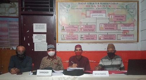 GardaMETRO.com, Bolsel - Pemerintah desa nunuk Dalam hal ini pjs sangadi Sarafudin taddi bersama ketua panitia pilsang Parwanto paputungan, menghimbau agar semua wajib pilih desa nunuk mengikuti protokol kesehatan Covid-19, Selasa (20/4/2021).