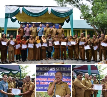 kepada 35 Kepala Sekolah yang hadiri saat ini yaitu berasal dari Kabupaten Sergai sebanyak 18 sekolah, Kabupaten Asahan 10 sekolah, dan Kabupaten Labuhan Batu 2 sekolah serta Kota Tebing tinggi 5 sekolah.Turut hadir dalam kegiatan ini ,Bupati Sergai Ir H Soekirman,Ketua DPRD Sergai dr.M.Riski Ramadhan Hasibuan,Kepala Dinas Lingkungan Hidup Provsu Dr.Ir. Binsar Situmorang ,M,Si,MAP,para Kepala OPD,Korwil se-Sergai serta para Kepala Sekolah dan guru-guru serta undangan dari kabupaten kota lainnya yang juga menerima penghargaan sekolah Adiwiyata.(derman yatviko).