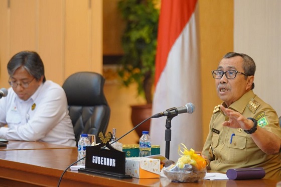 Saat koordinasi dengan SKK Migas dan seluruh KKKS wilayah Riau, Gubernur Syamsuar didampingi Asisten II Setdaprov Riau Job Kurniawan. Turut Hadir Kepala Dinas ESDM Provinsi Riau, Evarefita, Kadis LKH Provinsi Riau Maamun Murod.*bnb.