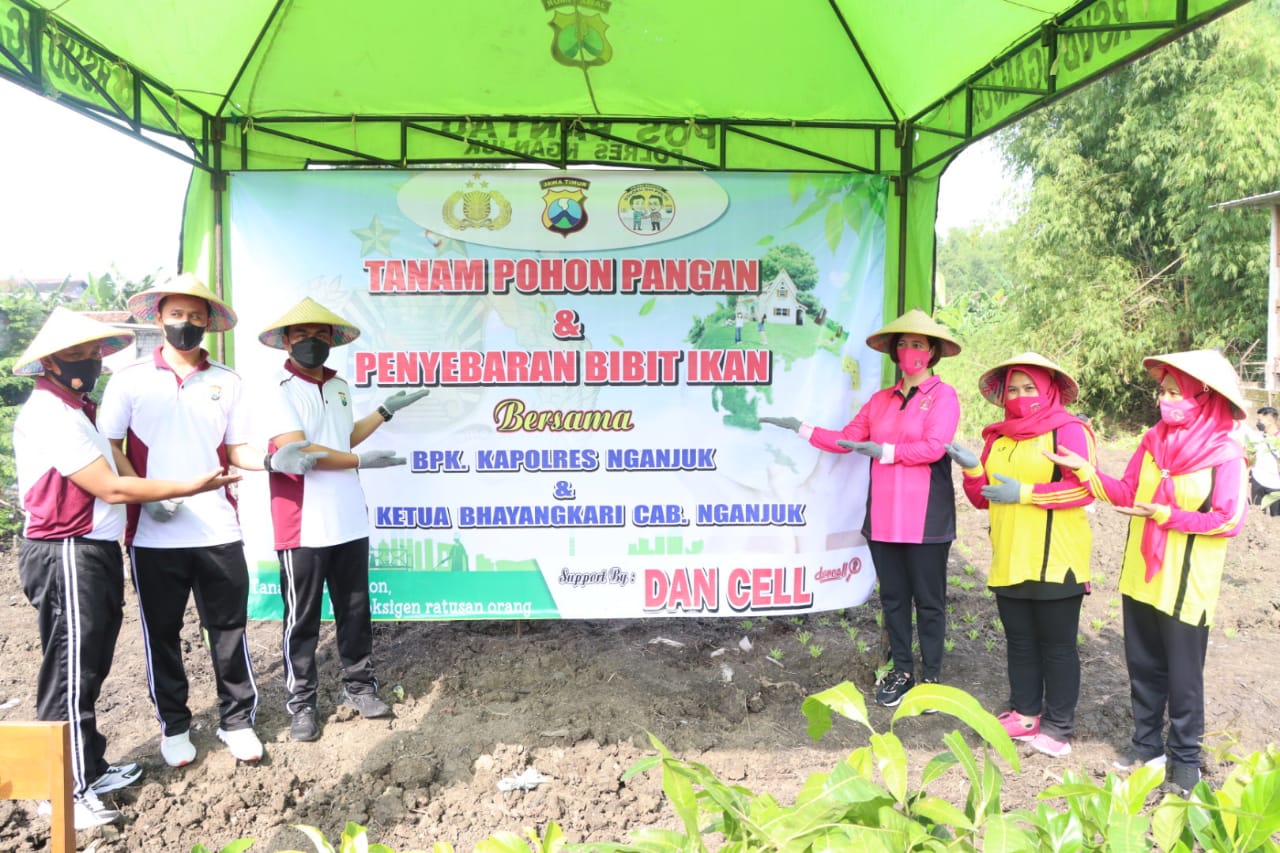 Gardametro.com| Nganjuk, Kapolres Nganjuk AKBP Boy Jeckson, S.H., S.I.K., M.H. Didampingi Pejabat Utama (PJU) bersama Ketua Bhayangkari Cabang Nganjuk melaksanakan penanaman pohon dan menyebar bibit ikan di lahan kosong di belakang Polsek Lengkong, Nganjuk, Jumat (17/12/2021). AKBP Boy Jeckson menyebut kegiatan ini dilakukan demi mewujudkan dan memperkuat ketahanan pangan bagi jajaran Polsek Lengkong dan masyarakat sekitar.