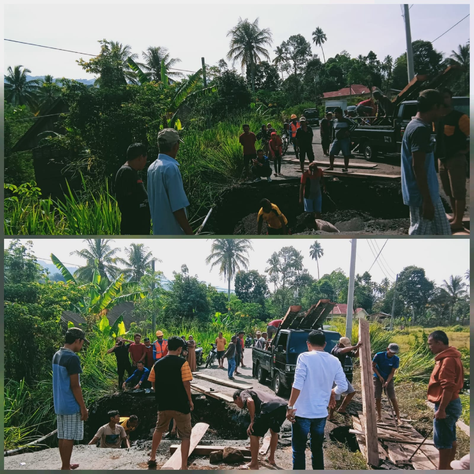 "lnsiden ini membuat macet lalu lintas penguna kendaraan yang melintas,Warga setempat bergotong royong untuk membuat akses jalan sementara dari pohon kelapa agar bisa penguna jalan melintas untuk sementara agar bisa di lalui sementara waktu.