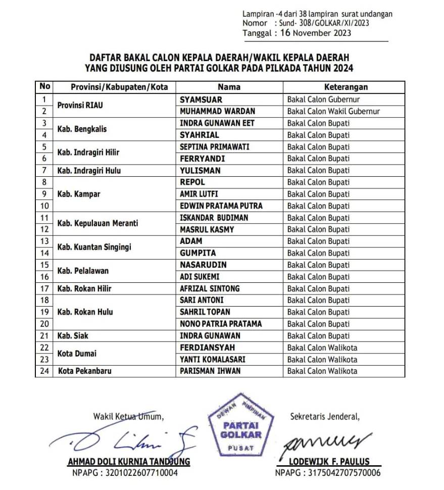 Berikut daftar bakal calon kepala daerah dari Golkar untuk Pilkada Riau 2024: