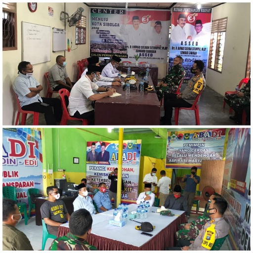 GardaMETRO.com, Sibolga - Kapolres Sibolga AKBP Triyadi dan Dandim 0211/TT Letkol Inf Dadang Alex, melaksanakan kegiatan silaturahmi di Kantor Center Pemenangan Paslon ASSED dan Paslon ABADI, dalam rangka mensukseskan pengamanan Pilkada serta mensosialisasikan Protokol Kesehatan guna mencegah penularan Covid-19.